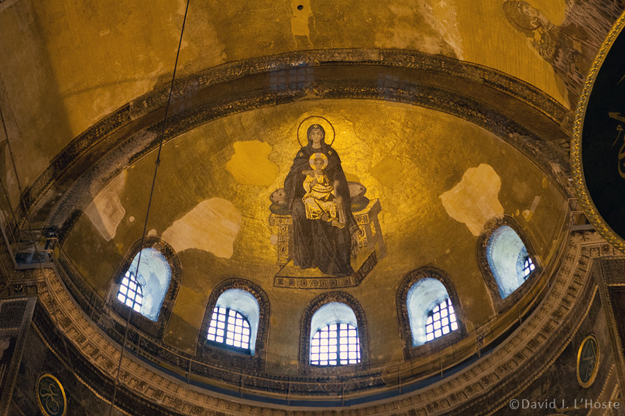 Hagia Sophia - Mosaic of Mary and Christ Child dating from ninth century. The oldest mosaic in Hagia Sophia, thought to be the first figurative decoration added after the Second Iconoclasm (814 - 842), wherein the Eastern Church banned religious icons. |