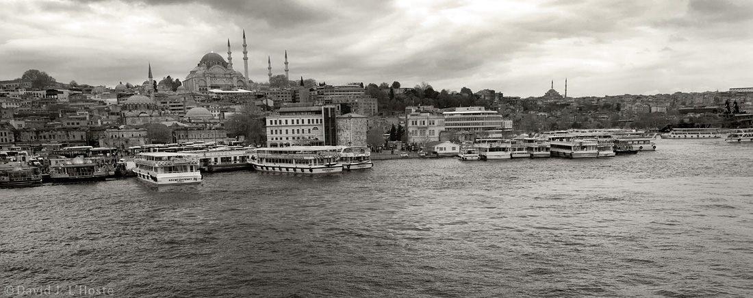 Süleymaniye Mosque above city bus hub and ferries moored on the Golden Horn (Haliç). This area is known as Eminönü.