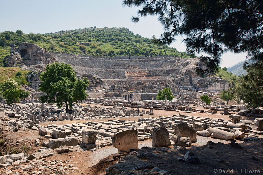 Roman Theater, Ephesus"The magnificent theatre is set into the side of a steep hill at the center of the ancient city. Its design, location and conception may have benefited from Hellenistic influences but its size and ornamentations are the products of Empirical Rome. The theatre was built at the end of the Hellenistic period, but it was significantly altered and enlarged by the Romans during the following five centuries. The theatre remained in use until the 5th century AD." "A major Hellenistic construction phase in Ephesus at the end of the 3rd century BC most likely produced the initial theatre that featured a cavea with a single tier of seats, an orchestra with a drainage channel, and a simple one-story scaenae (stage house). Under the Romans, beginning about 40 AD, the theatre was expanded and renovated to become the massive structure that we see today." Source: The Ancient Theater Archive by Amanda Heffernan (student research assistant), Whitman College. 2003 |