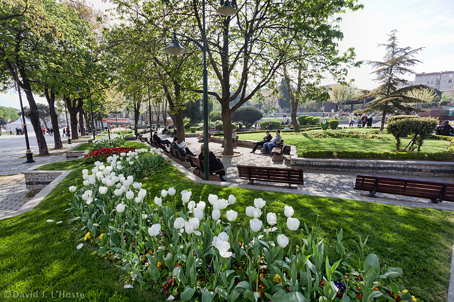 Tulips in Mehmet Akif Ersoy Park (Denise hiding behind lightpole, center)