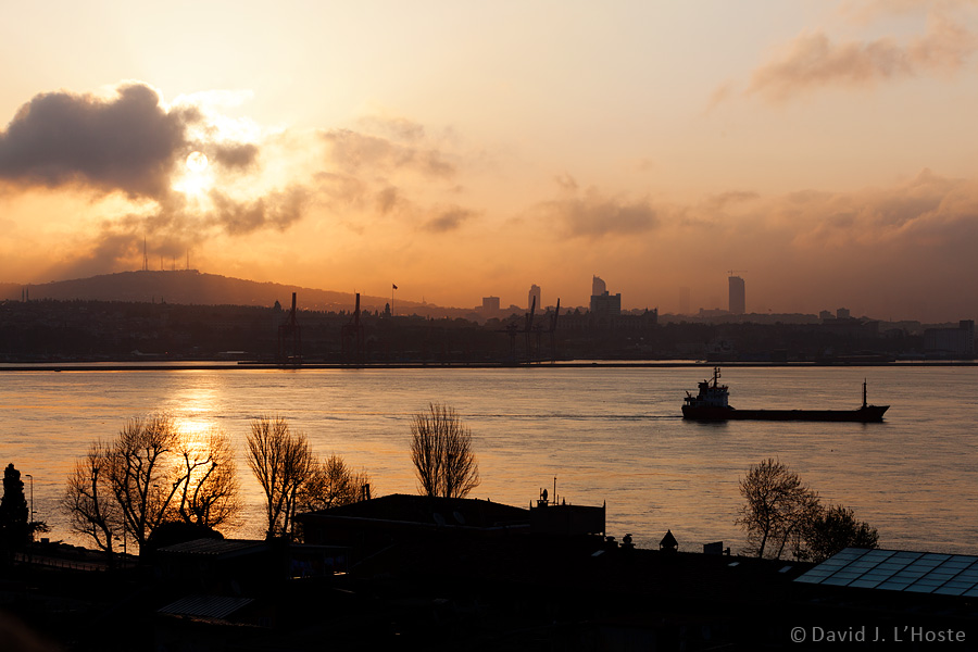 Ship leaving the Bosphorus at Sunrise (view toward east from rooftop restaurant of Ferman Hotel)