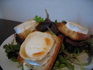 This salad consists just of mixed greens in a light mustard vinaigrette, topped with small rounds of goat cheese that have been placed on bread slices and broiled until warm. Think of it as a green salad with goat cheesy croutons. A delicious first course and one I crave. Salade au Chèvre Chaud 4 (½-inch thick) slices goat cheese, from a log (or individual crottin de chèvre, cut in half horizontally) Place slices of goat cheese on the bread slices and broil just until the cheese start to melt. Do not let it melt completely. Whisk together the vinegar, mustard, salt and pepper. Whisk in the oil and add the shallots at the end. Drizzle the greens with the dressing and sprinkle walnuts around the plate. Top the salad with the goat cheese toasts. Et voila. Serves 2. Any basic vinaigrette works as a dressing. |