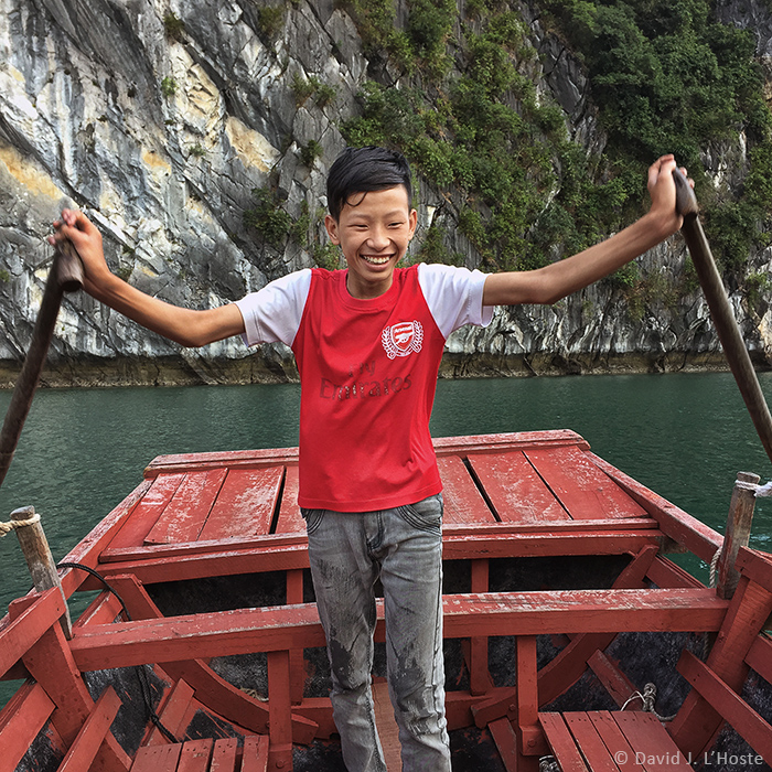 Floating village resident rowing bamboo boat among the karsts of Halong Bay.