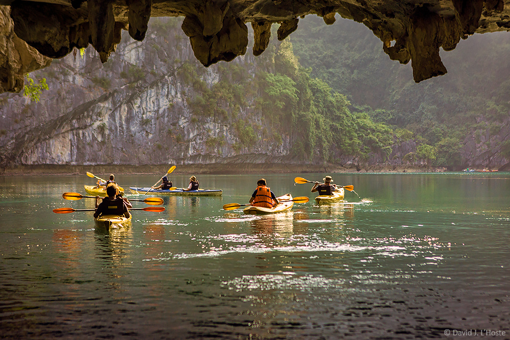 Kayaks emerging from cave, Halong Bay, Vietnam. (halongbay-0951)
