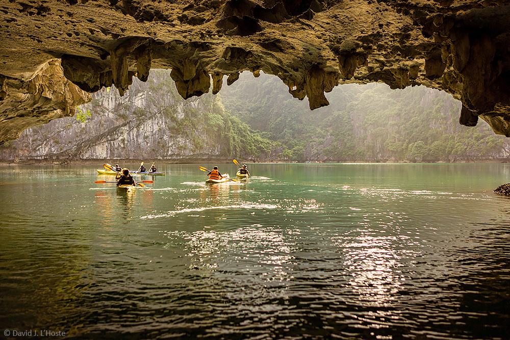 Kayaks emerging from cave, Halong Bay, Vietnam. (halongbay-0952)