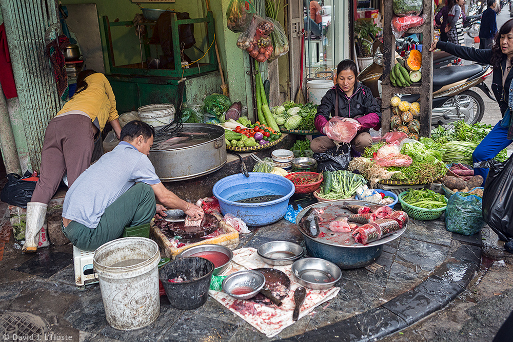 Sidewalk Fishmonger and Produce Market, Old Quarter, Hanoi, Vietnam