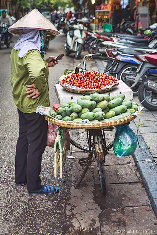 Street Vendor with Cellphone. Old Quarter, Hanoi, Vietnam. (Img_0707)