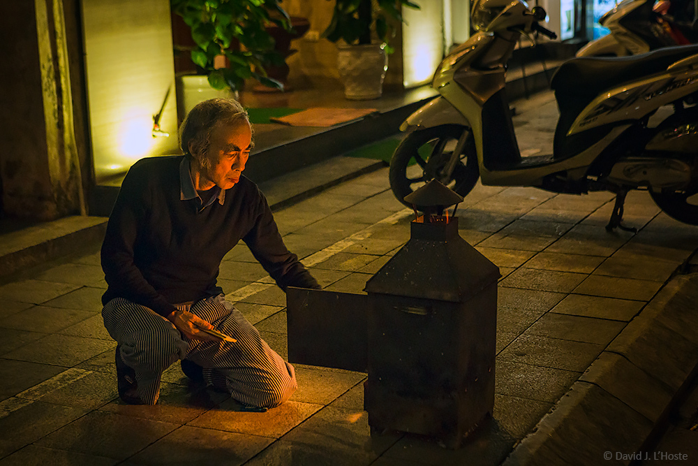 | A man kneels on a Hanoi sidewalk to burn Ghost Money (aka Spirit or Heaven Money, or Joss Paper) fake paper money burned in honor of ancestors, to be spent by them in the other world, and to bring good fortune to the living descendant. Old Quarter, Hanoi, Vietnam. |