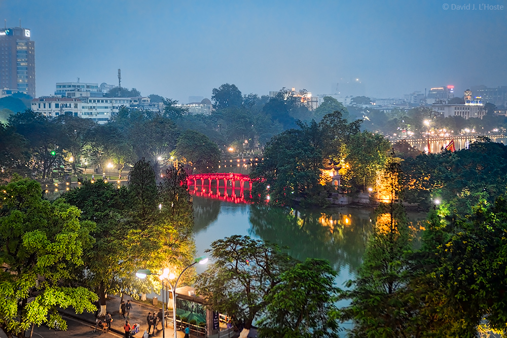 The red Huc (rising Sun) Bridge crosses to an island, which houses the Ngoc Son Temple, in Hoan Kiem Lake. Old Quarter, Hanoi, Vietnam.