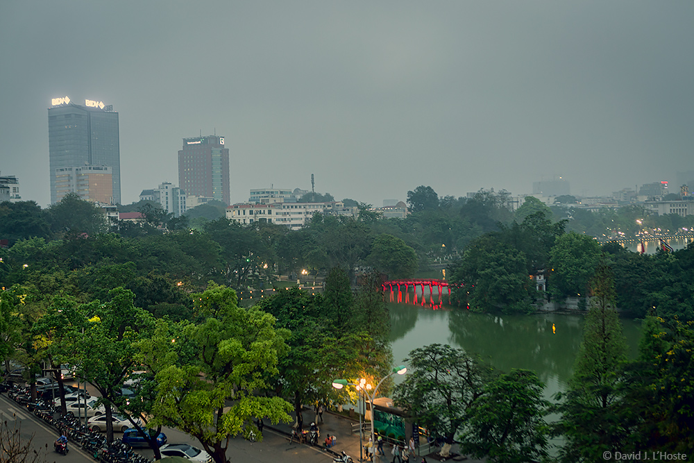View of the red Huc (rising Sun) Bridge and Hoan Kiem Lake. Old Quarter, Hanoi, Vietnam.