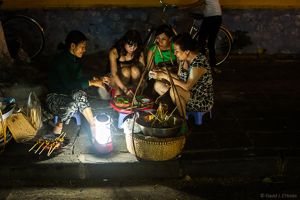 | Everywhere in Vietnam we visited it was a common sight to observe a lady with two baskets on a yoke set down the load, pull out a lantern, a grill, containers of fish sauce, rice paper, greens, peppers, and pork or chicken. The ultimate pop-up restaurant. |