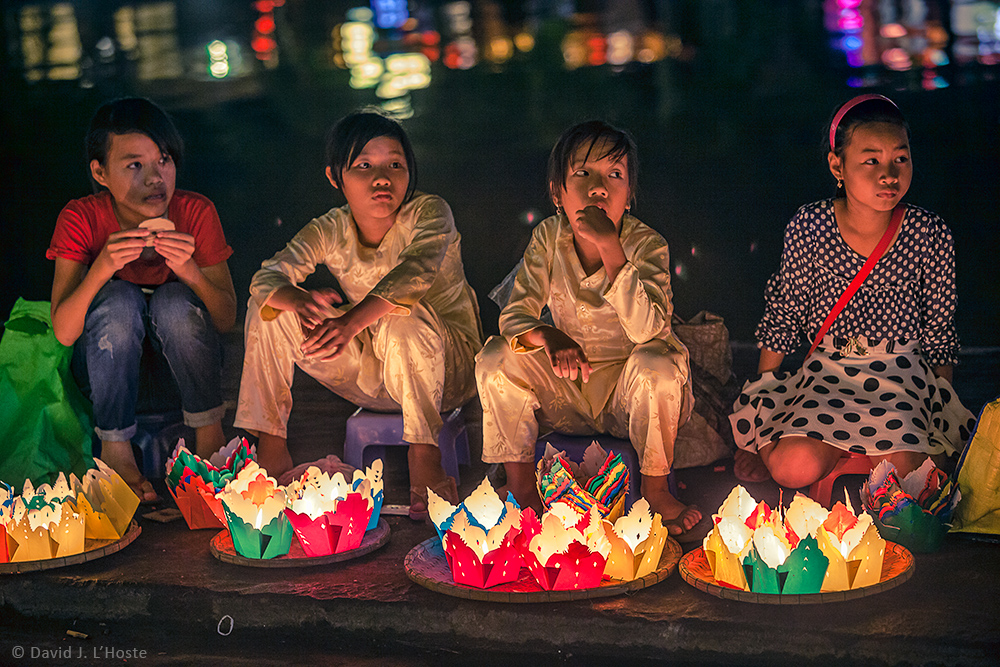Young girls selling boxed candles to float on the Thu Bon River in Hoi An, Vietnam.