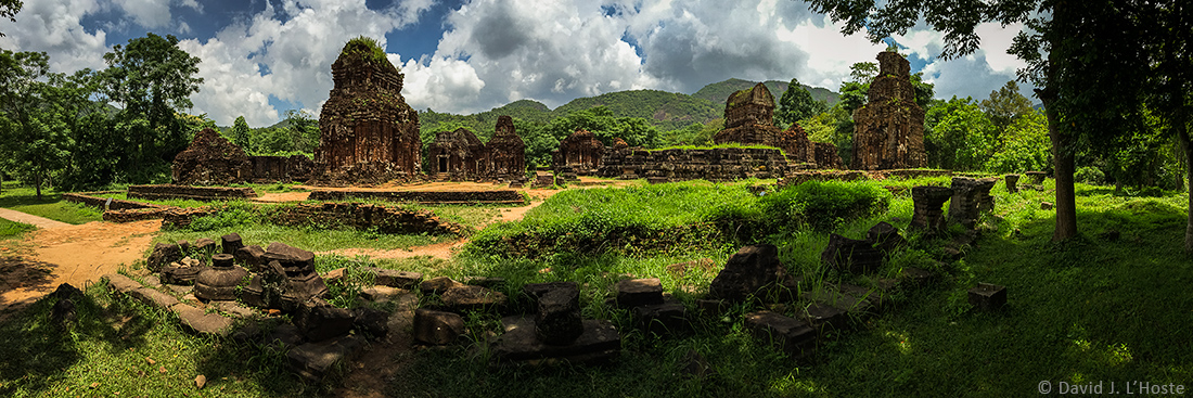 | iPhone panorama of the Ruins of My Son (pronounced me sun). Of the more than 70 temples constructed between the 4th and 14th century AD by Cham kings, only portions of 20 remain today. The temples were carpet-bombed by U.S. B-52s during the American War. Champa was an ancient Indochinese kingdom which endured over what is now central coastal Vietnam from the 2nd century AD, holding off the Viet to the north and the Khmer to the west and south, until it was finally taken over and subsumed by Vietnam in the 19th century. The site was granted UNESCO World Heritage status in 1999, and restoration efforts are currently underway by Vietnam. (It is one of the places in Vietnam where you do not want to stray from well-worn trails as the area is rife with unexploded ordinance.) |