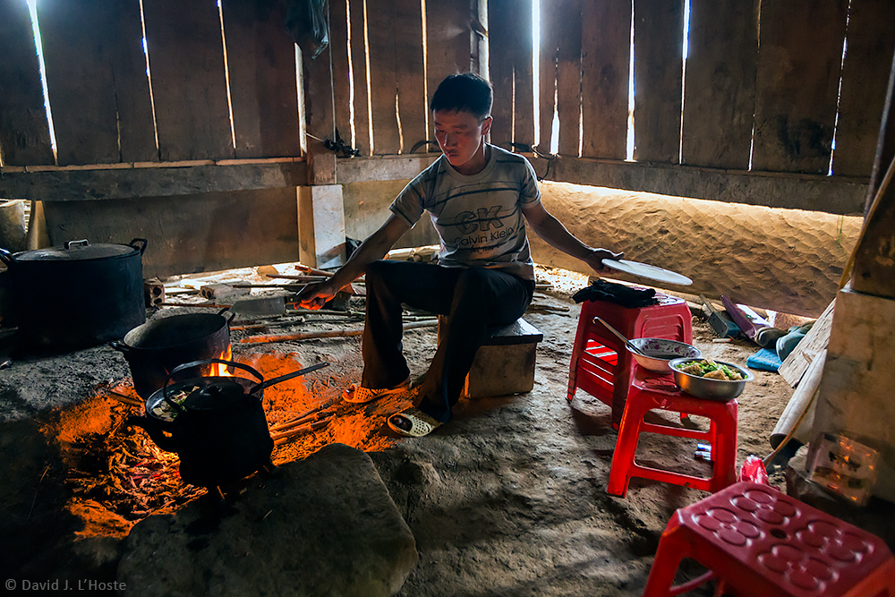 Zu's husband cooking greens which grow wild on the mountain and he collected on his way home for lunch. Zu told me the Hmong name for the greens (there is no Vietnamese word for them), but she can't write and I know zero Hmong.