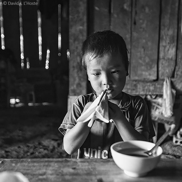 Zu's son works on a paper airplane after lunch.