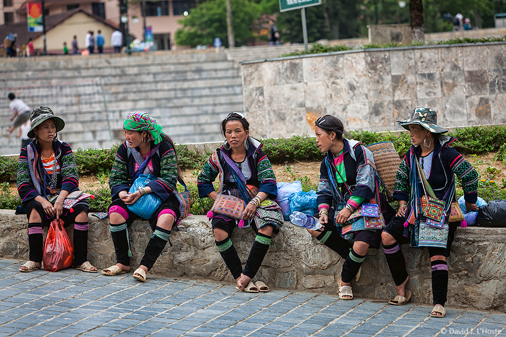 Black Hmong Women in Sapa Town waiting to set out their embroidered wares at the Friday Night market.