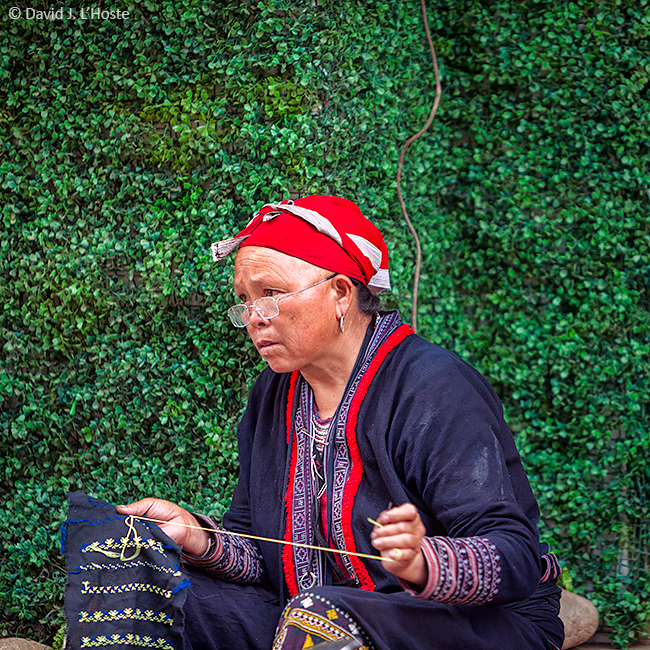 Red Dao woman in Sapa embroidering as she offers her wares for sale.