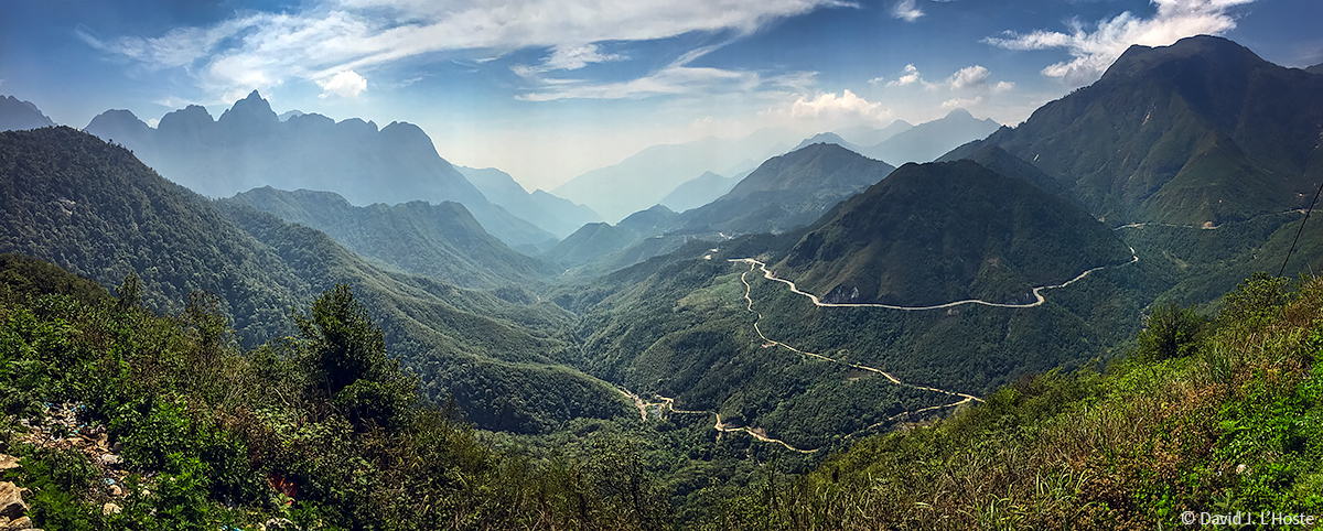 | iPhone panorama of the Hoàng Liên Son Mountains and the tallest peak in Vietnam, Fansipan. This view, which shows the road from Sapa to Lai Châu, is from near the Tram Ton Pass (Heaven Gate). Sapa is at 1600 meters, Tram Ton Pass is at 1900 meters, and Fansipan rises to 3143 meters. |