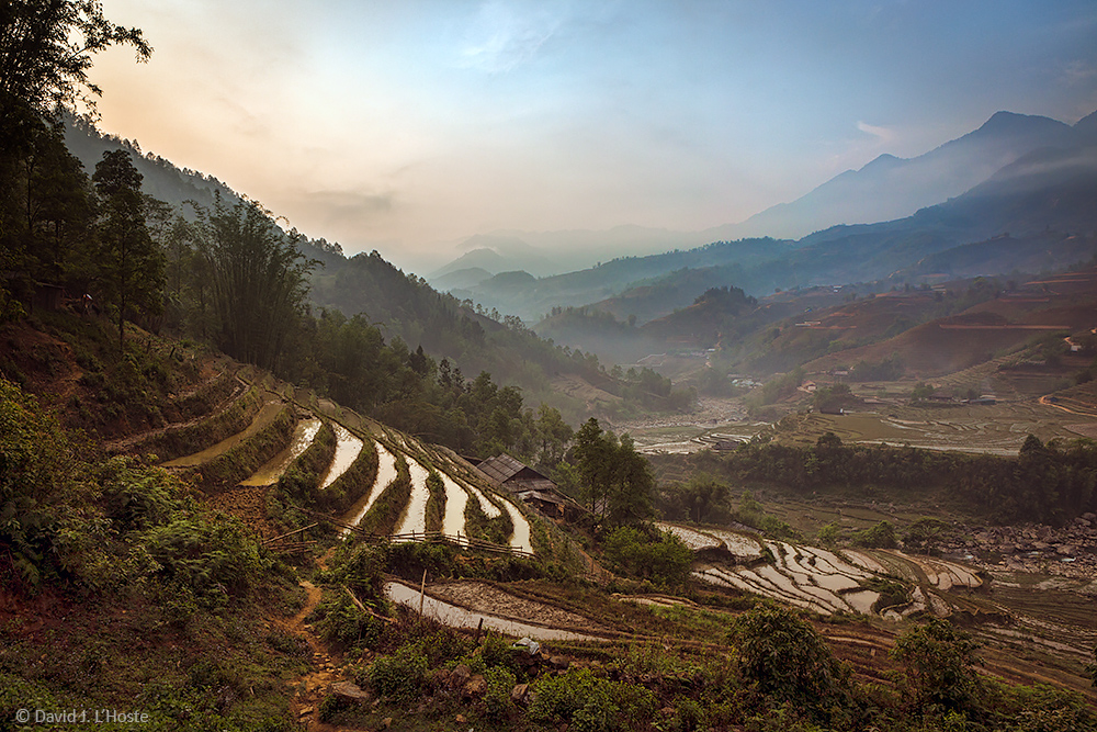Early morning overlooking Mường Hoa River valley near Sapa, showing flooded, terraced rice paddies.